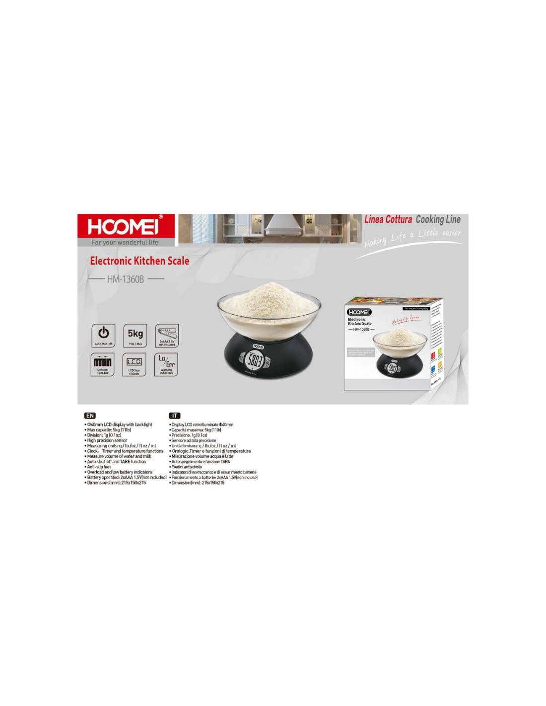 Perfetta per pesare con precisione ingredienti solidi e liquidi, la bilancia HM-1360B è lo strumento indispensabile per chi ama cucinare con precisione e semplicità.