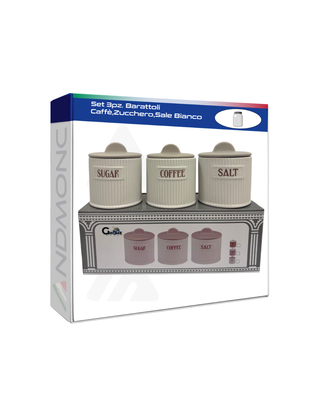 Contenuto: 3 barattoli con scritte “Caffè”, “Zucchero” e “Sale”