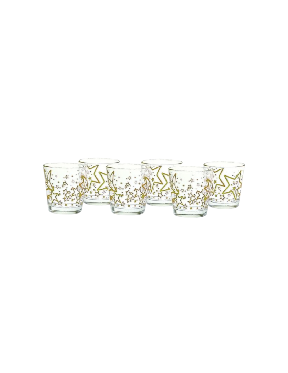 Rendi le tue tavole ancora più eleganti con questo esclusivo set da 6 bicchieri in vetro con decorazione oro a forma di stella. Il design raffinato e la finitura dorata li rendono perfetti per le occasioni speciali, le festività e le cene più ricercate.