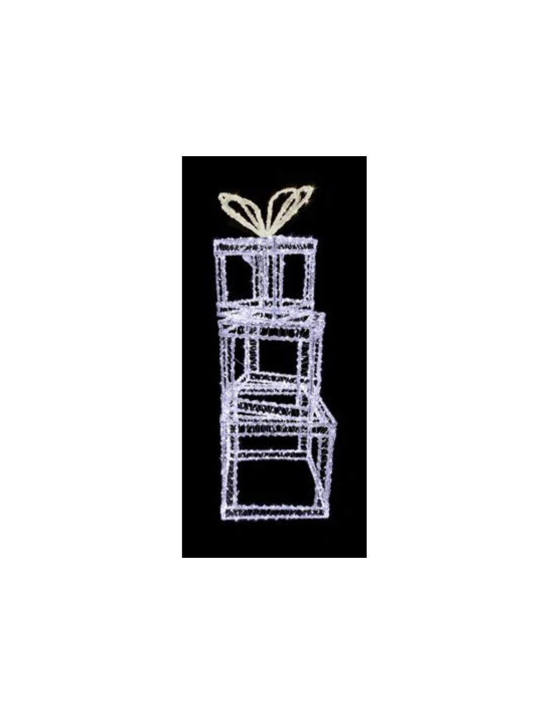 La struttura dei pacchi regalo, curata in ogni dettaglio, è impreziosita da un elegante fiocco bianco, che completa il design con un tocco sofisticato e contemporaneo. Grazie alla sua altezza importante e alla luminosità dei LED, questa decorazione è perfetta per allestire ingressi, soggiorni, negozi, vetrine, hall e spazi dedicati alle festività.
