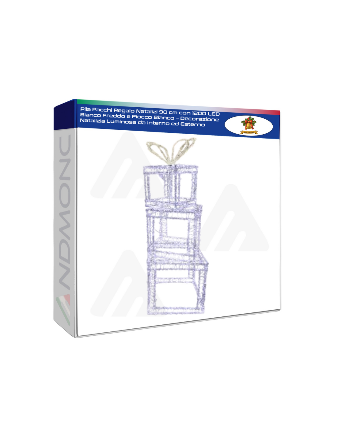 Pila Pacchi Regalo Natalizi 90 cm con 1200 LED Bianco Freddo e Fiocco Bianco – Decorazione Natalizia Luminosa