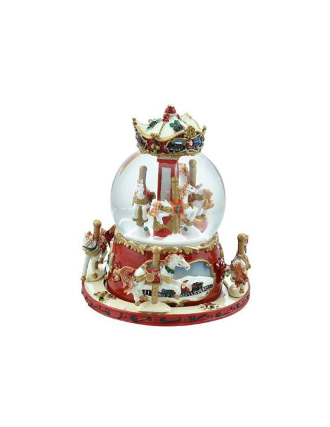 Il meccanismo a carillon diffonde una delicata melodia che rende l’ambiente ancora più accogliente e romantico, richiamando il fascino delle giostre d’epoca. I dettagli curati, le rifiniture eleganti e la struttura compatta la rendono una decorazione perfetta per ogni tipo di arredamento natalizio.