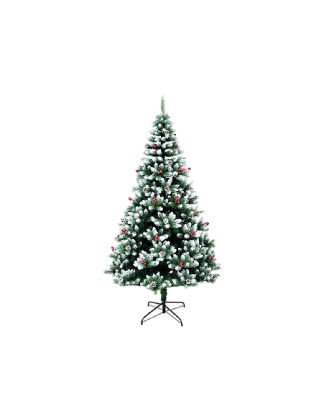 Le punte innevate e le bacche rosse decorative donano all’albero un affascinante effetto invernale, richiamando il fascino dei boschi ghiacciati. Il colore verde intenso, combinato con l’effetto neve, rende questo modello perfetto per un allestimento natalizio elegante, moderno e di forte personalità.