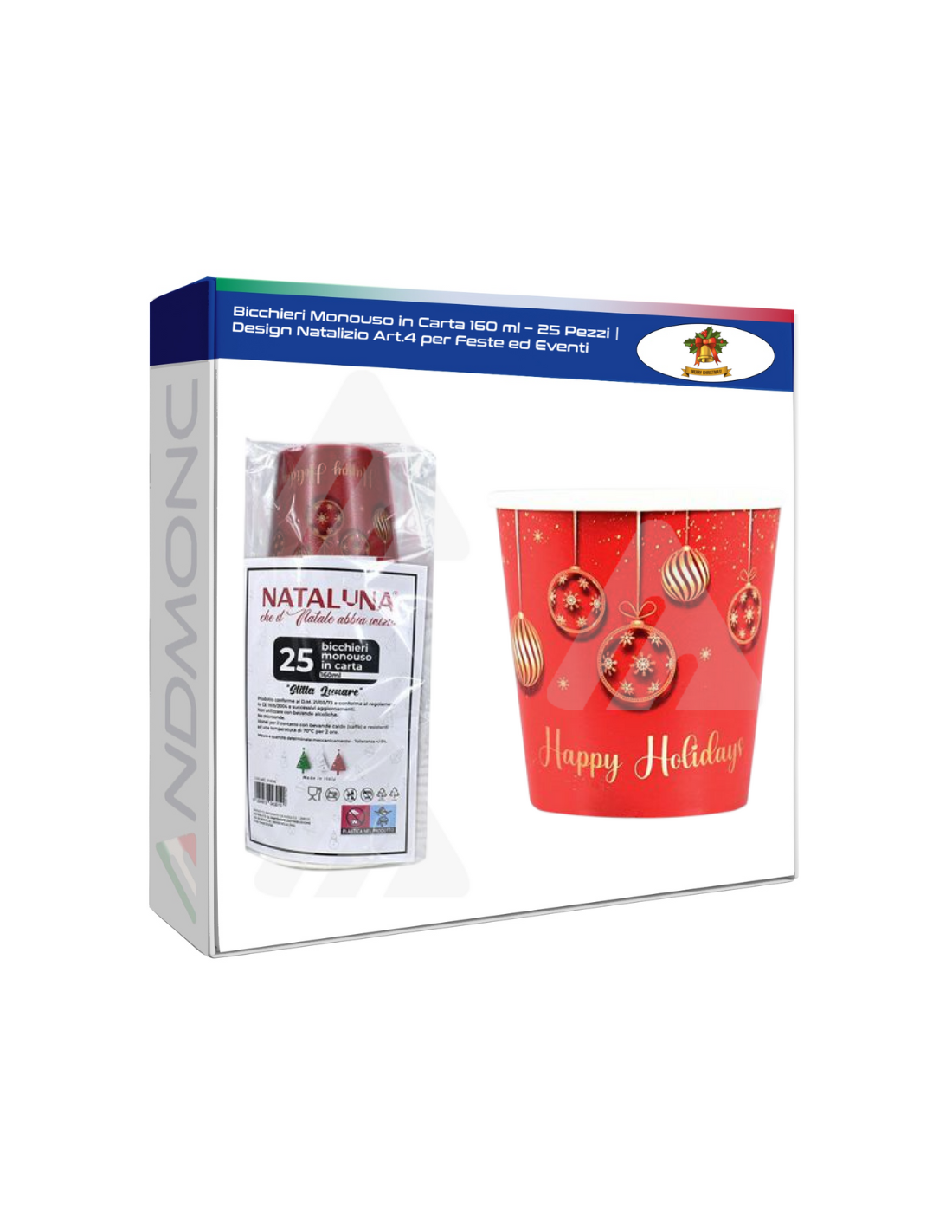 Porta sulla tua tavola tutta la magia delle feste con i bicchieri monouso in carta da 160 ml dal design Natalizio Art.4. Questo set da 25 bicchieri è perfetto per decorare con stile pranzi, cene, buffet e feste durante il periodo natalizio. Realizzati in carta resistente, sono ideali per servire bevande calde e fredde, mantenendo praticità e sicurezza in ogni occasione.