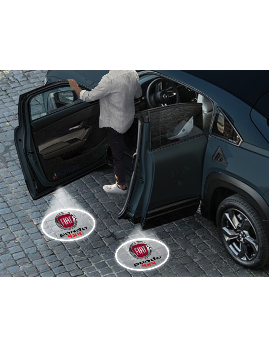 • Kit luci led sottoporta modello Carbonio, sensore automatico intelligente con Proiezione logo Fiat Panda 4x4, kit da 2 o da 4 Porte