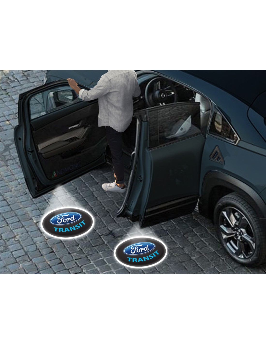 • Kit luci led sottoporta modello Carbonio, sensore automatico intelligente con Proiezione logo Ford Transit, kit da 2 o da 4 Porte