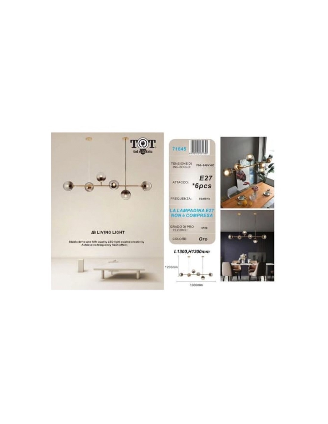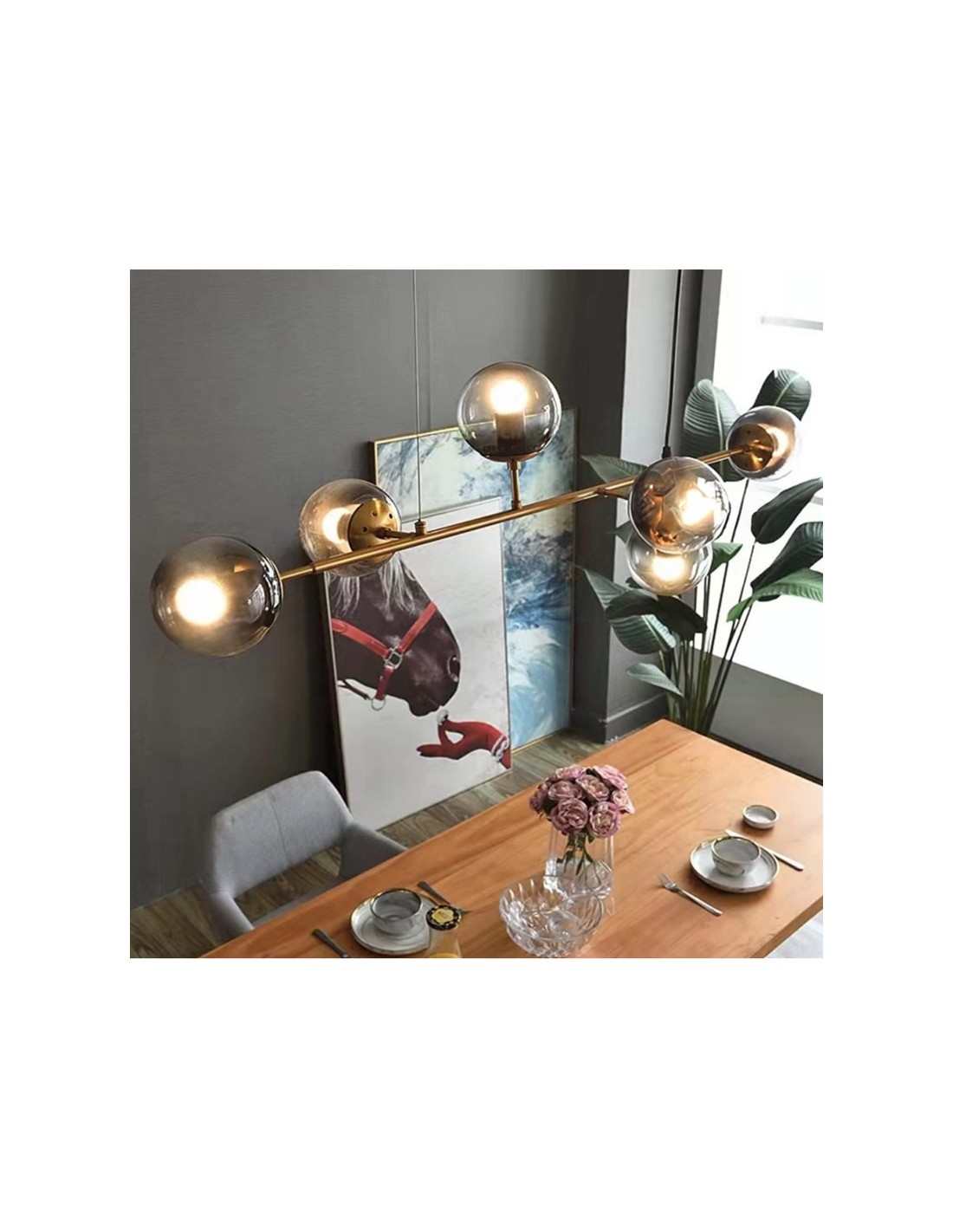 Realizzato in metallo dorato con rifinitura satinata e sfere in vetro fumé. Sorgente luminosa con attacco grande E27 (lampadina non inclusa)