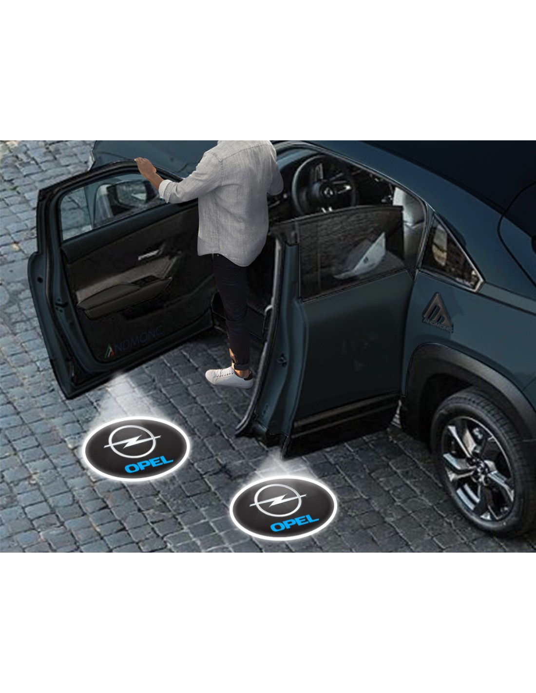 • Kit luci led sottoporta modello Carbonio, sensore automatico intelligente con Proiezione logo Opel, kit da 2 o da 4 Porte