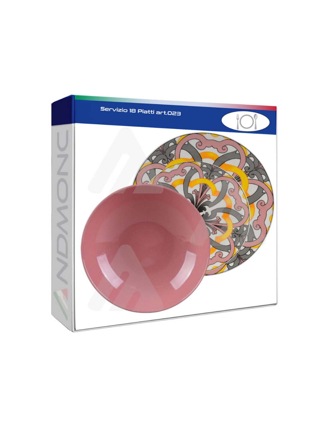 Porta stile e funzionalità sulla tua tavola con il Servizio 18 Piatti art.023. Questo set completo include piatti piani, fondi e da dessert, ideali per i pasti di tutti i giorni così come per le occasioni speciali. Realizzato con materiali di alta qualità, assicura resistenza, durata e facilità di pulizia.