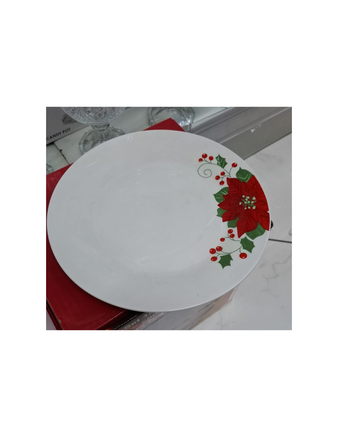 Realizzato in ceramica bianca con decorazioni festive di stelle di Natale, agrifoglio e bacche rosse, dona un tocco raffinato e accogliente alle tue cene natalizie.