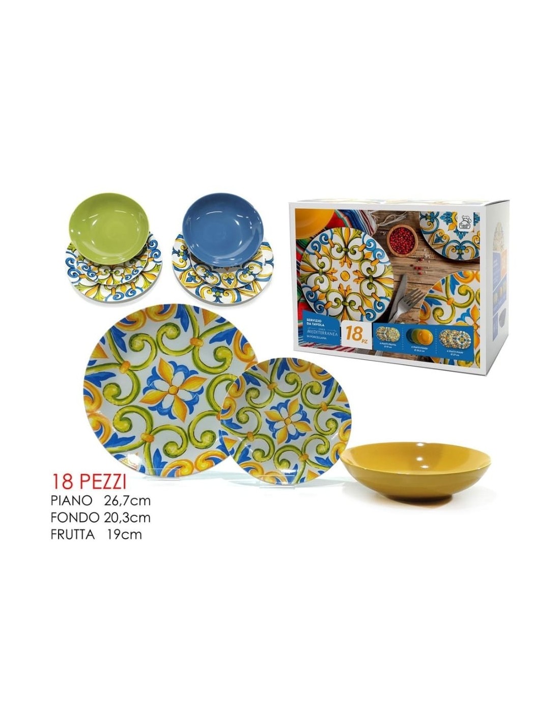 Scopri l'eleganza solare del Servizio Piatti Porcellana 18pz linea mediterranea: porta il calore e lo stile del Sud sulla tua tavola! Con piatti piani da 26,7cm, fondi da 20,3cm e frutta da 19cm, questo set trasforma ogni pasto in una vacanza culinaria.