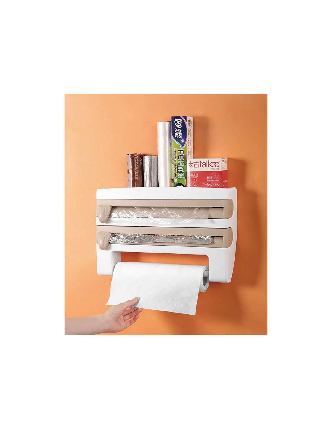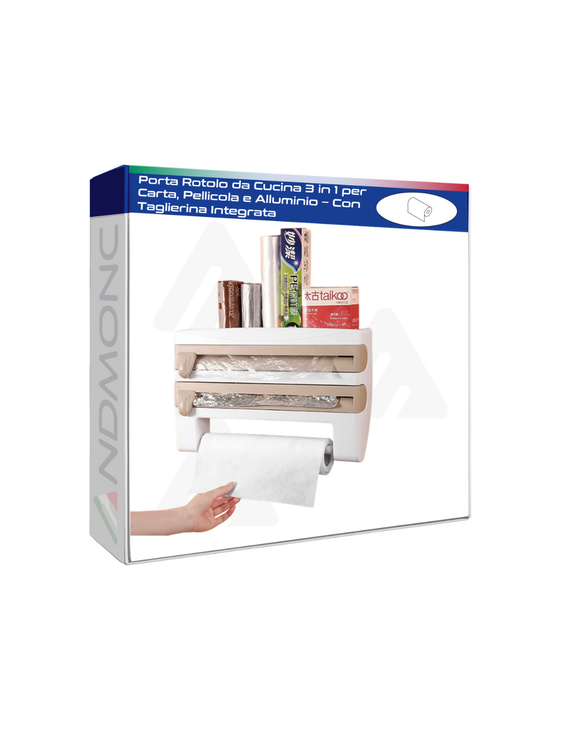 Organizza la tua cucina con il porta rotolo 3 in 1, pratico e funzionale, ideale per avere sempre a portata di mano carta da cucina, pellicola trasparente e carta alluminio.