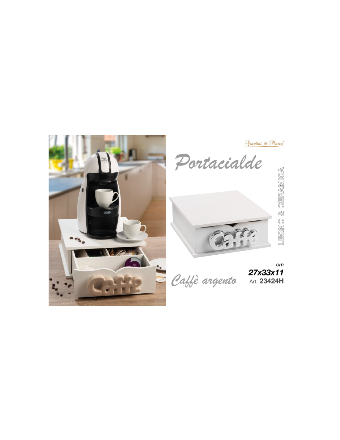 Elegante e dal gusto contemporaneo, questo portacialde unisce la calda texture del legno alla brillantezza della ceramica smaltata color argento. Pensato per chi desidera un angolo caffè raffinato e organizzato, si distingue per il suo design sobrio ma decorativo, perfetto per ambienti moderni, classici o shabby chic.