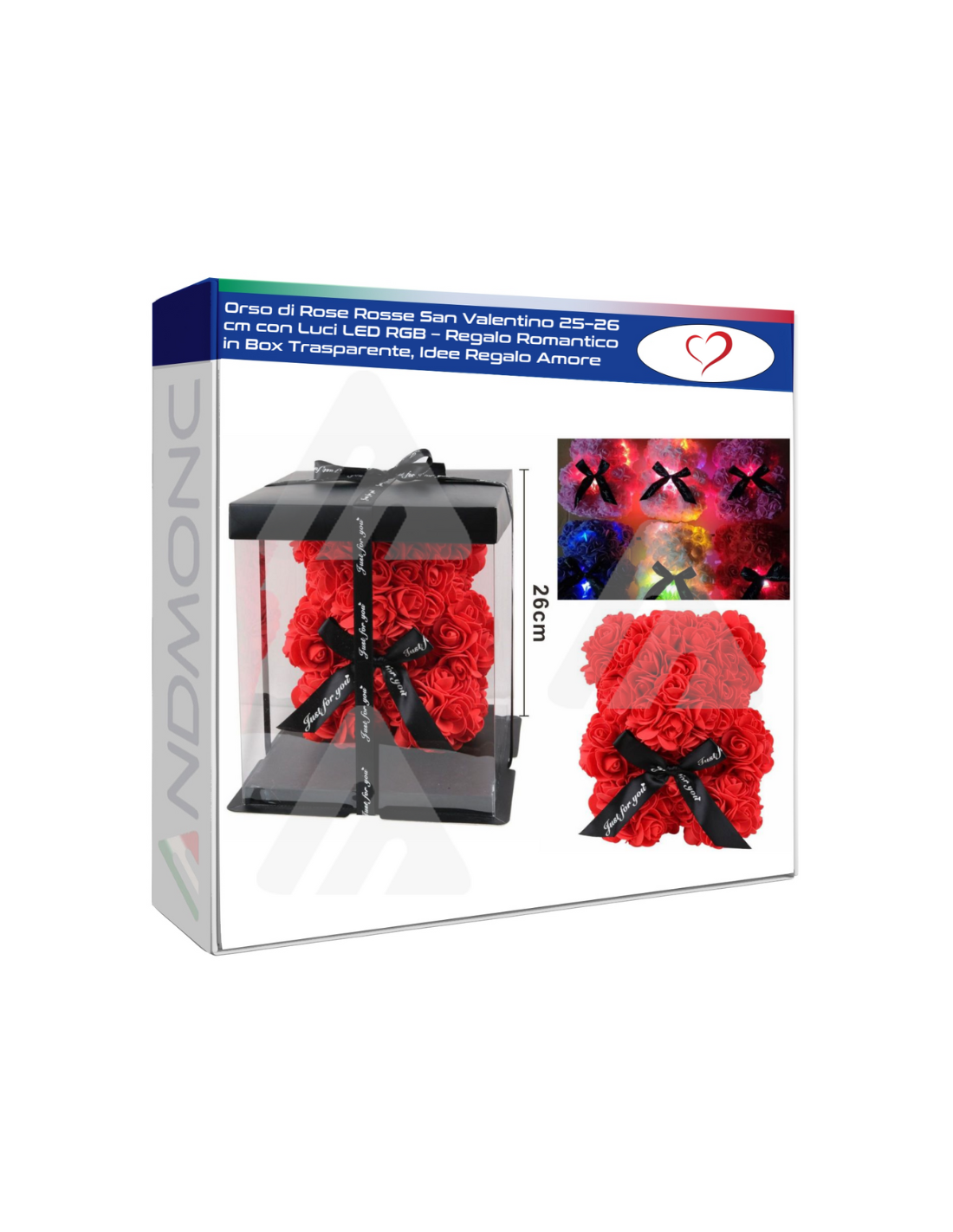 Orso di Rose Rosse San Valentino 25–26 cm con Luci LED RGB – Regalo Romantico in Box Trasparente, Idee Regalo Amore