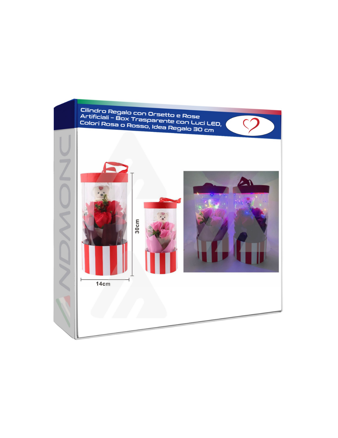 Cilindro Regalo con Orsetto e Rose Artificiali – Box Trasparente con Luci LED, Colori Rosa o Rosso, Idea Regalo 30 cm