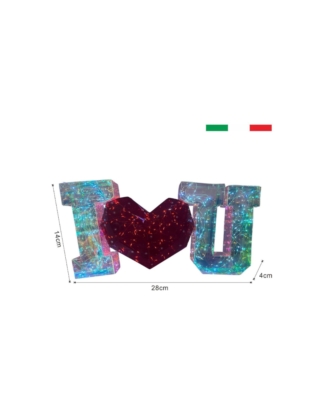 Realizzata in materiale trasparente effetto cristallo, la scritta è arricchita da luci LED multicolor che illuminano le lettere e il cuore, regalando riflessi brillanti e suggestivi. Ideale come decorazione da tavolo, comodino, mensola o vetrina.