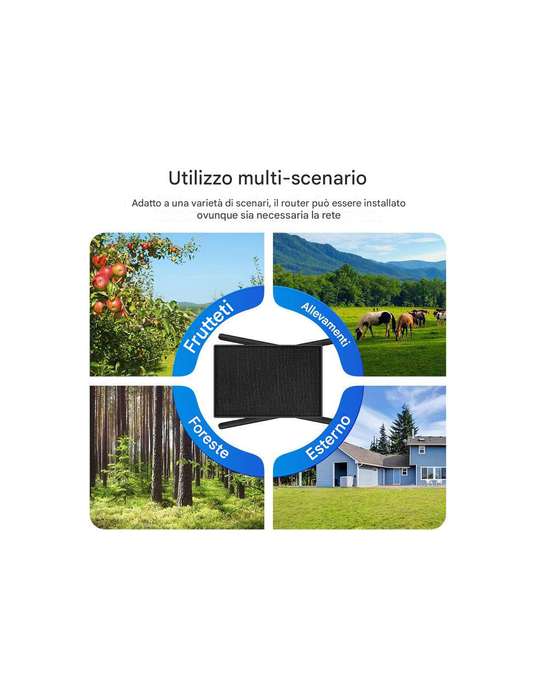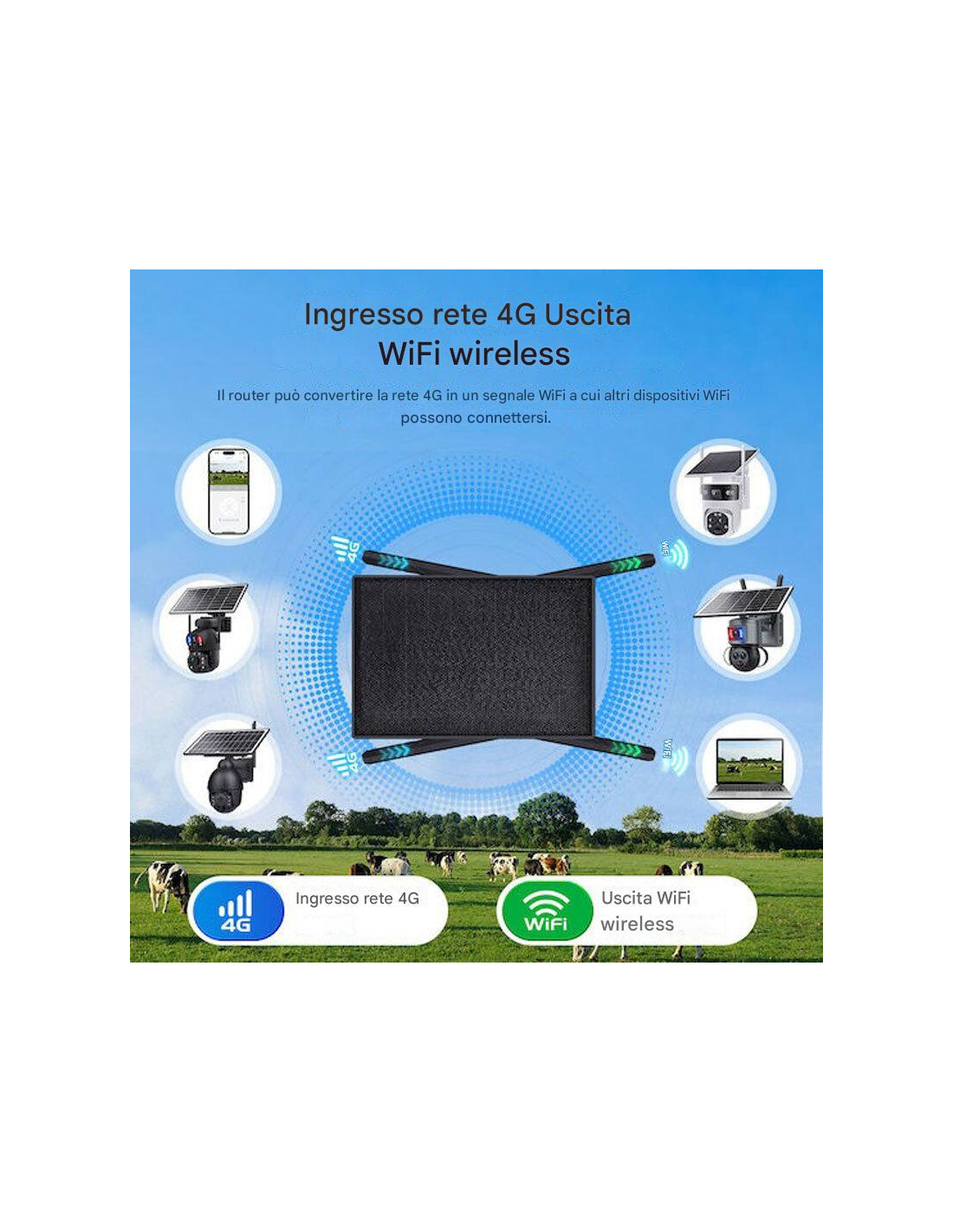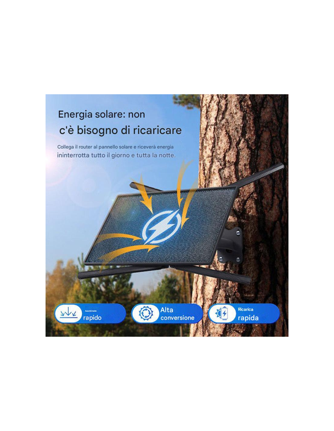 Facile da installare e progettato per un utilizzo versatile, è ideale per viaggi, campeggio, cantieri, case remote o situazioni d’emergenza. Con antenna potenziata e design resistente, assicura buona copertura Wi-Fi e autonomia prolungata grazie alla ricarica solare.