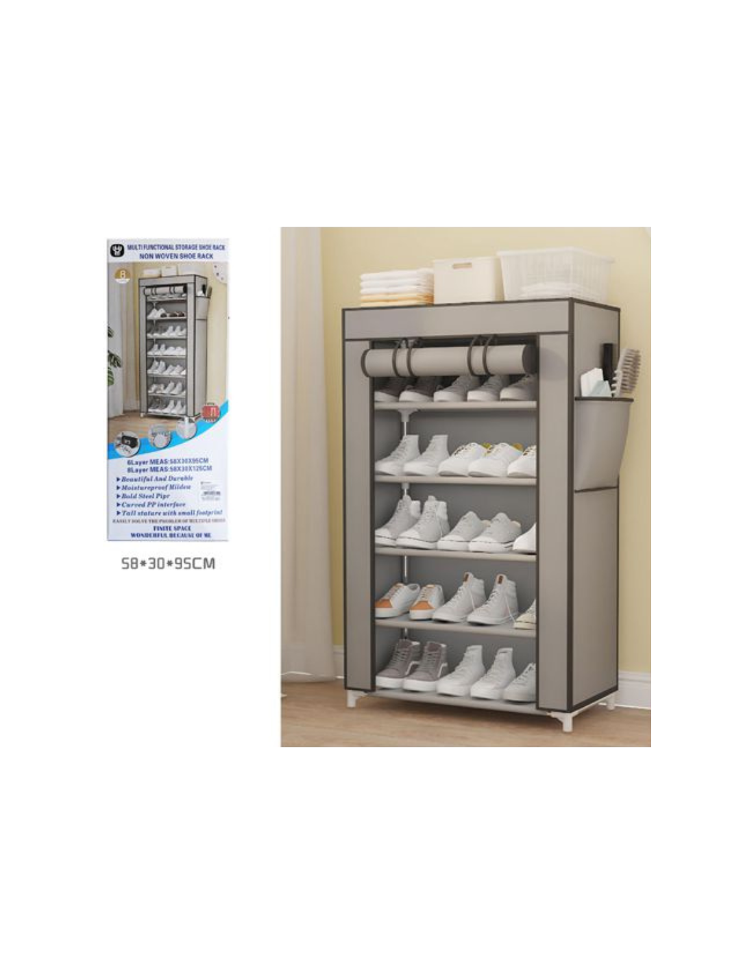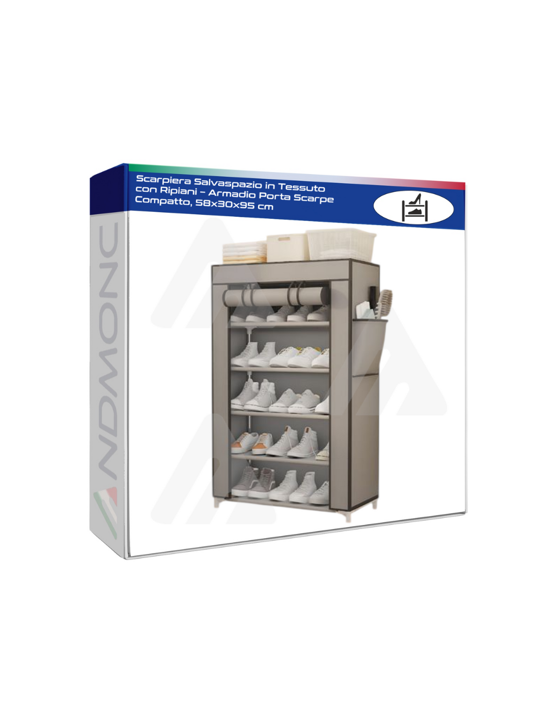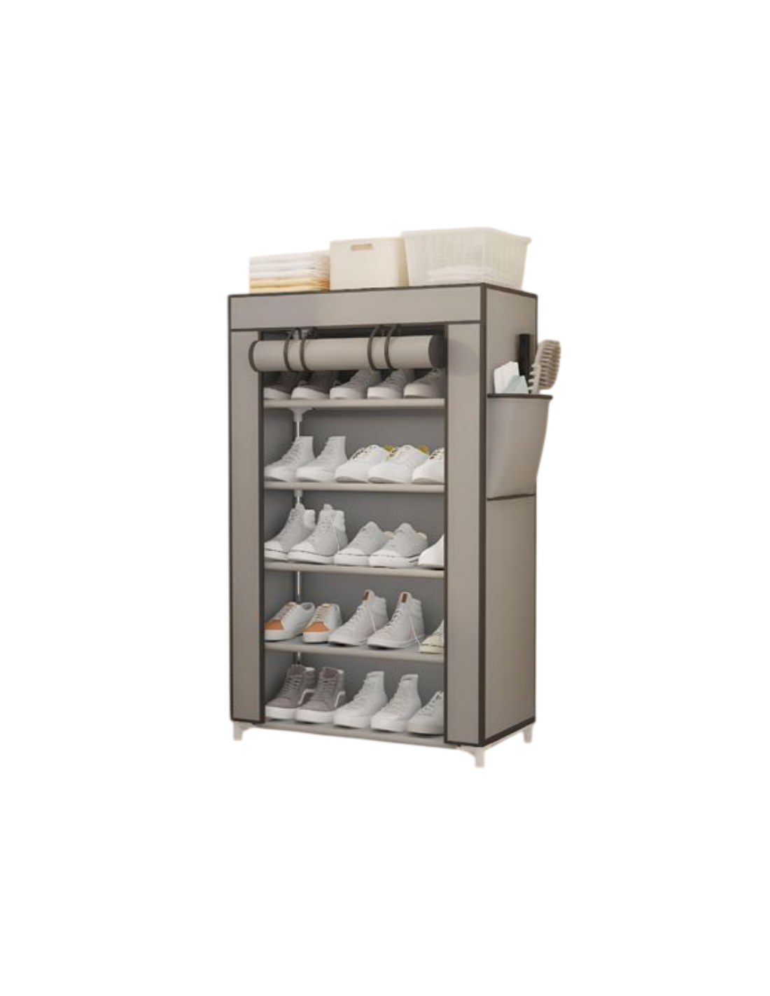 Realizzata in tessuto resistente con struttura stabile, protegge le calzature da polvere e sporco. È dotata di ripiano superiore utilizzabile per riporre scatole, asciugamani o accessori, rendendola ancora più funzionale.