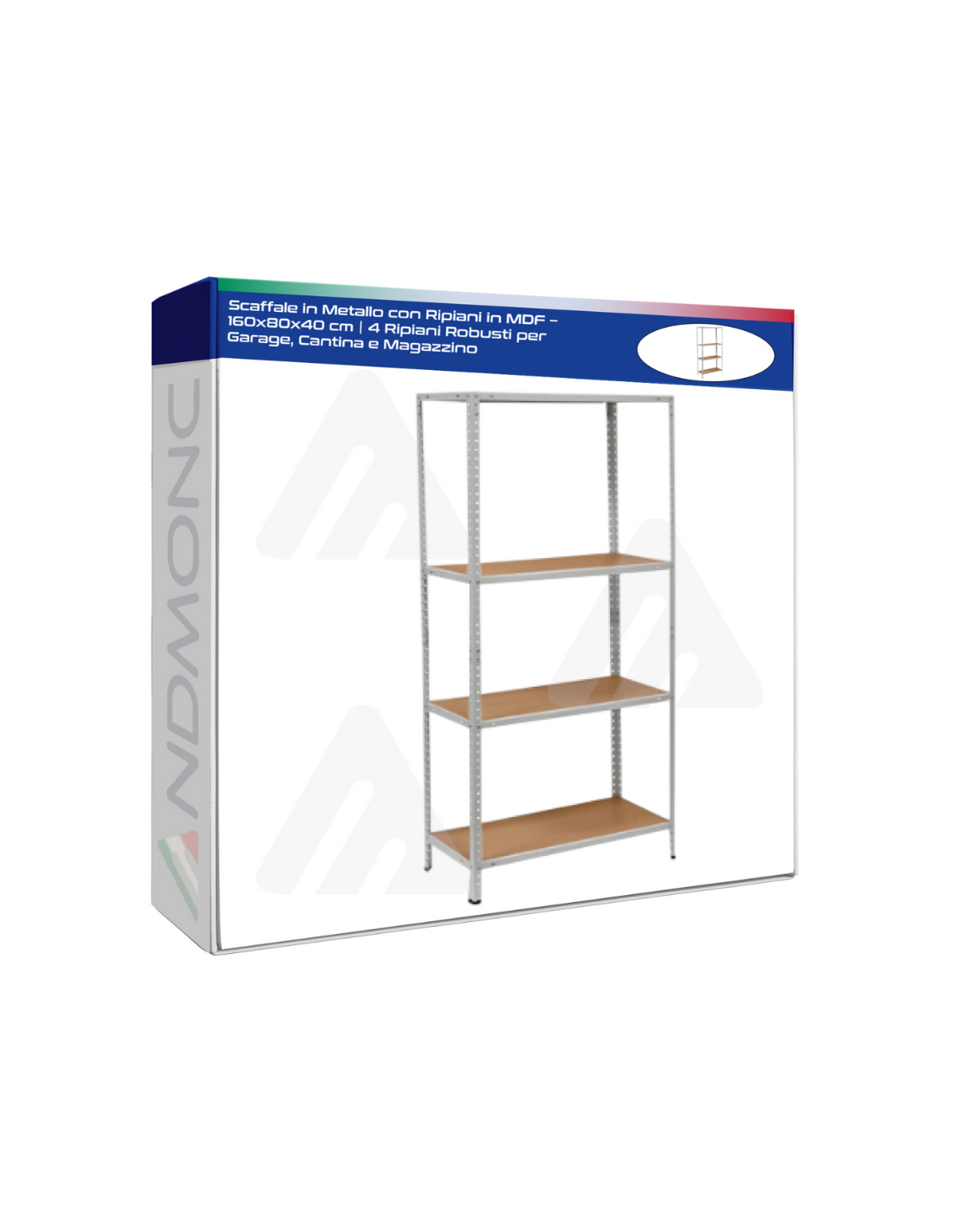 La struttura in acciaio verniciato garantisce solidità e sicurezza, mentre i ripiani in MDF offrono un supporto stabile per scatole, attrezzi, prodotti e materiali vari.