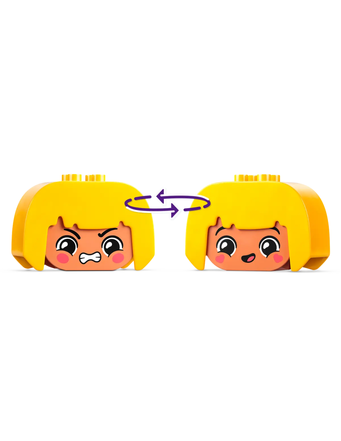 Giocattoli educativi creativi: impilando imattoncini colorati, i bambini abbinano o mettono in contrasto le capigliature dei personaggi, quindi decidono come si sentono i personaggi LEGO® DUPLO® con i mattoncini espressivi.