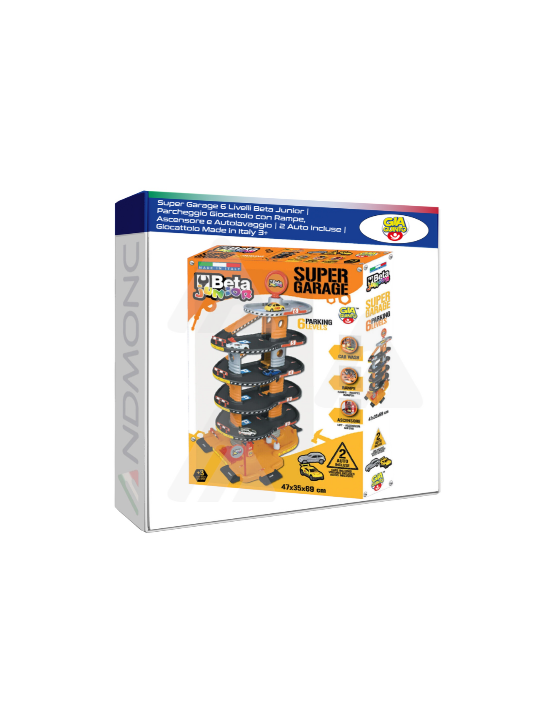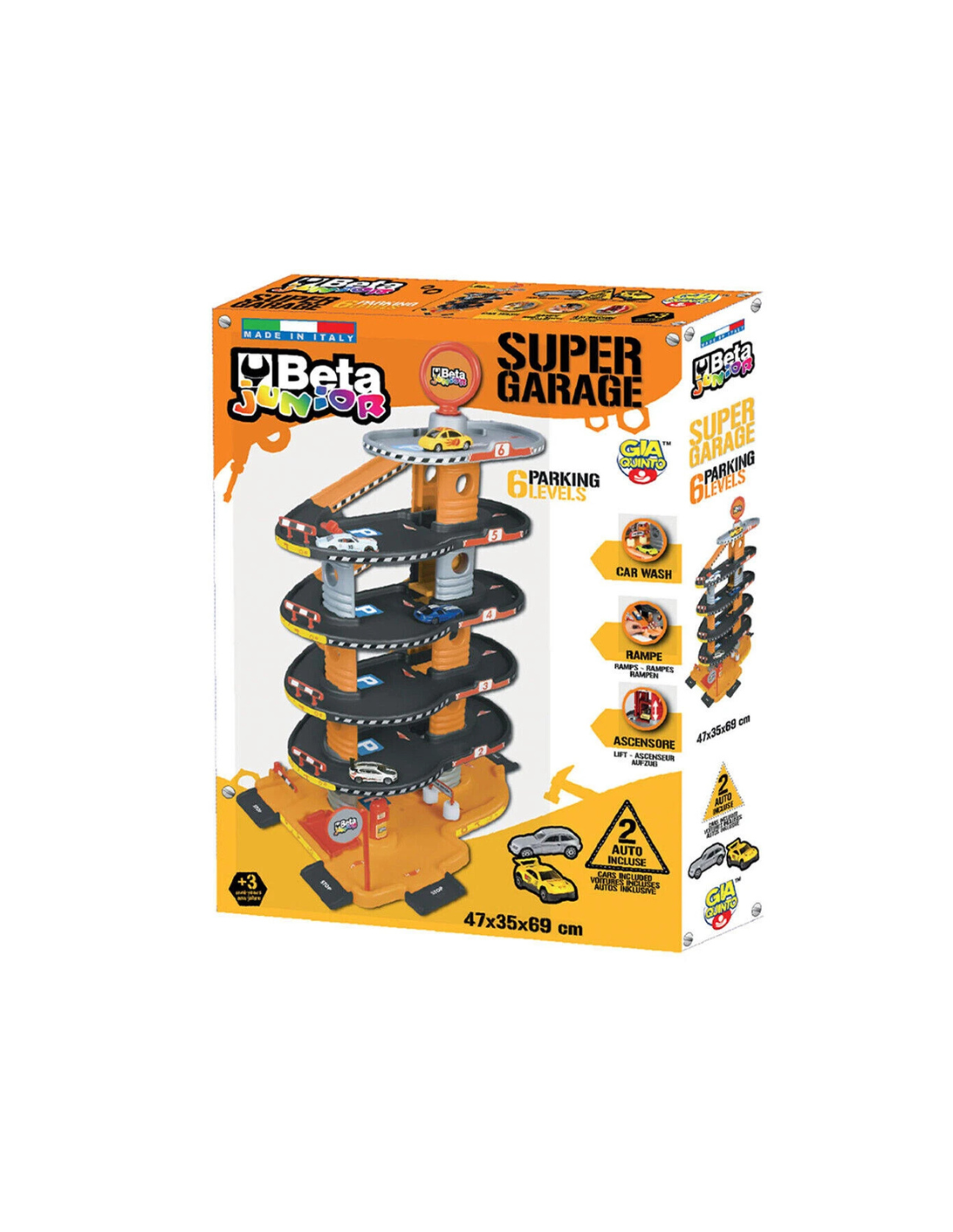 Il Super Garage Beta Junior è il playset perfetto per tutti i piccoli appassionati di macchinine! Con i suoi 6 livelli di parcheggio, rampe lunghe e curve, ascensore funzionante e autolavaggio, questo garage garantisce ore di divertimento e gioco creativo. Realizzato Made in Italy, unisce qualità, resistenza e sicurezza per bambini dai 3 anni in su.