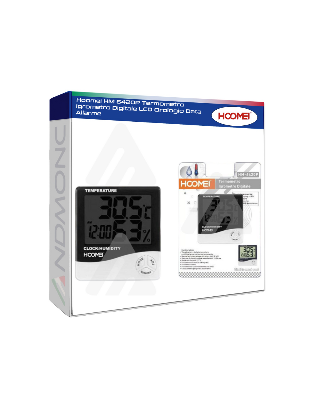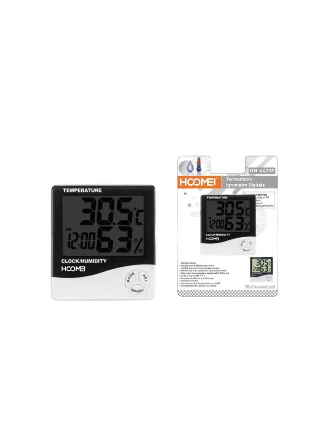 Il Hoomei HM-6420P è un termometro igrometro digitale multifunzione progettato per offrire un monitoraggio completo delle condizioni ambientali. Con un ampio display LCD, visualizza simultaneamente la temperatura, l'umidità, l'orario e la data, permettendoti di avere tutte le informazioni necessarie a portata di mano.