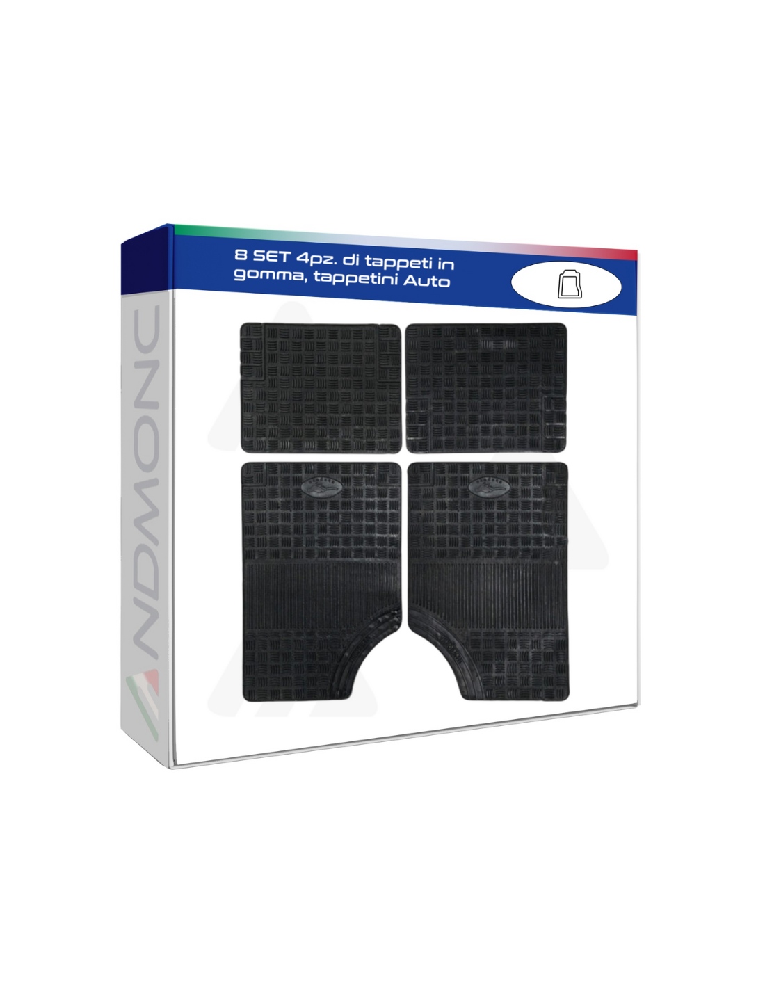 SET di tappeti in gomma, provvisti di fondo puntinato antiscivolo che li rende stabili e sicuri. Il disegno ad alveo consente di trattenere acqua, fango, neve e sabbia, permettendo l'utilizzo in ogni stagione dell'anno. Si adattano facilmente a qualsiasi modello di auto